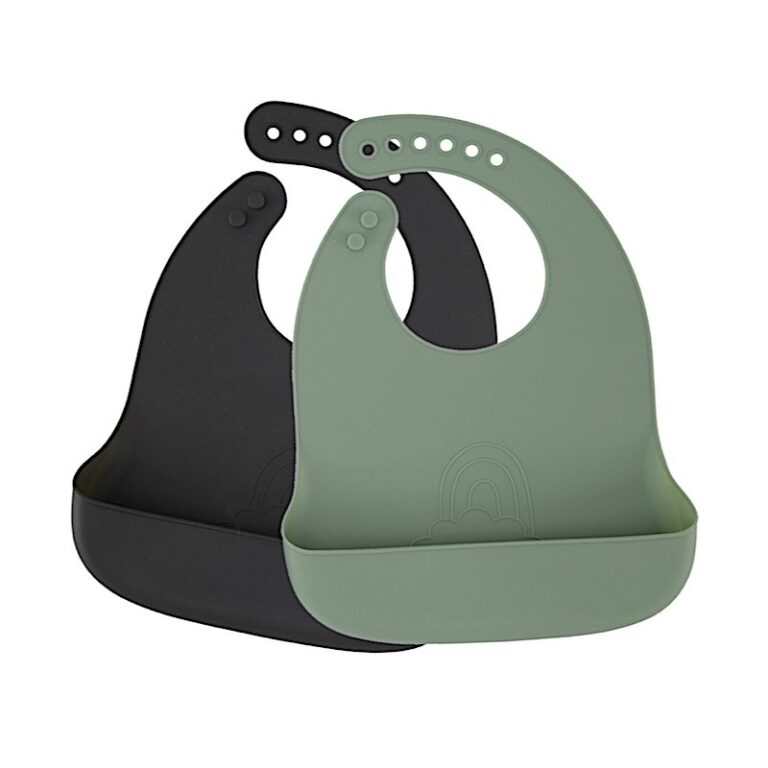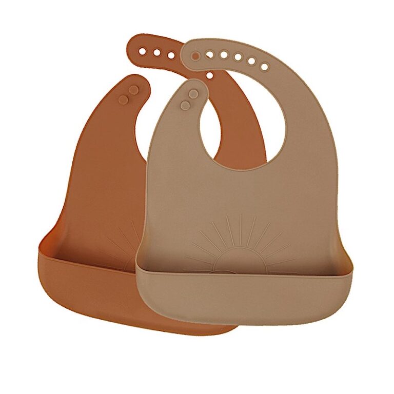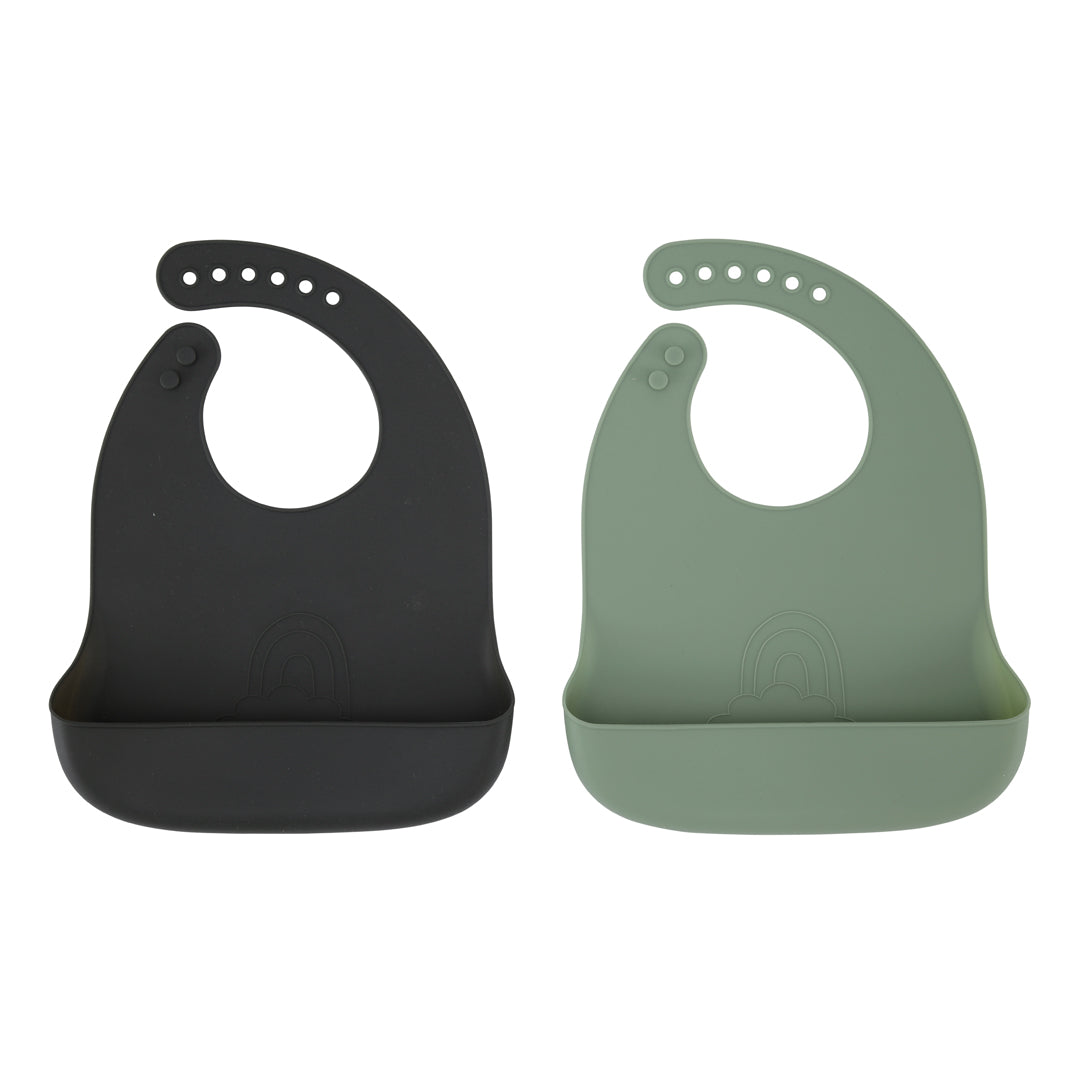 Ein Satz von 2 Latzer in trendigen Farben, je nach Farbe mit einer Sonne oder einem Regenbogen gedruckt. Aus weichem Silikon.