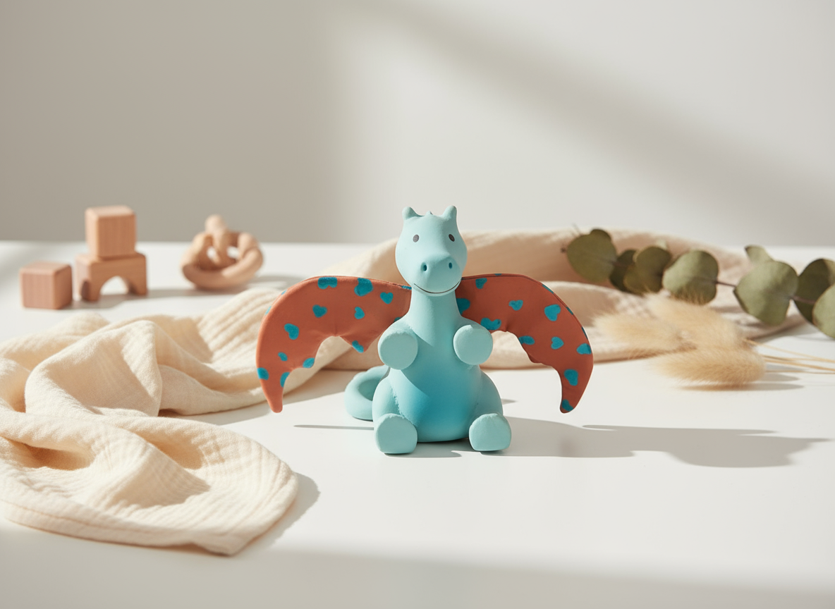 Tikiri Fairy Tales: SONNENDRACHE mit roten Flügeln 13cm, Naturkautschuk und Baumwolle, in Fensterbox, 0+
