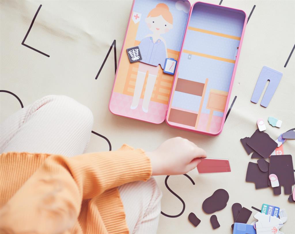Les boîtes de jeu magnétiques originales de voyage de la marque australienne « mierEdu » se déclinent en 3 thèmes : métiers, véhicules et personnages de contes de fées. Chaque boîte contient deux scènes avec, d'un côté, un personnage à habiller et, de l'autre côté, un décor avec plus de 30 pièces magnétiques. Pour jouer à la maison et en voyage !