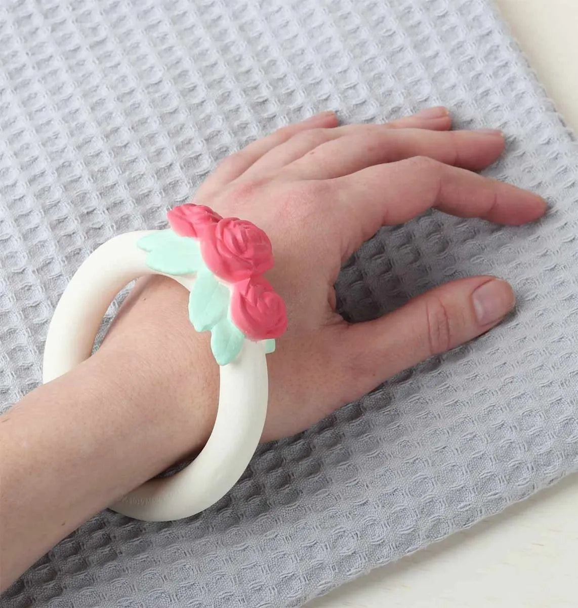 Your toddler makes his teeth? This rose buttons ring is a perfect solution. The dentition toy is made with 100% natural rubber of the hevea tree, has a subtle perfume and does not contain harmful substances. Perfect for each baby or toddler who feels discomfort because of the teeth.