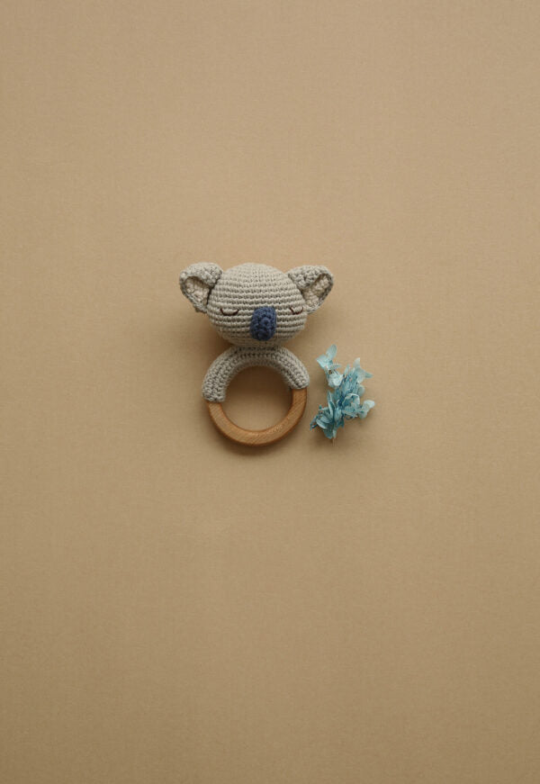This adorable koala has a bell inside that makes a nice sound when it is shaken. The wooden ring is perfect for relieving baby gums. span>
