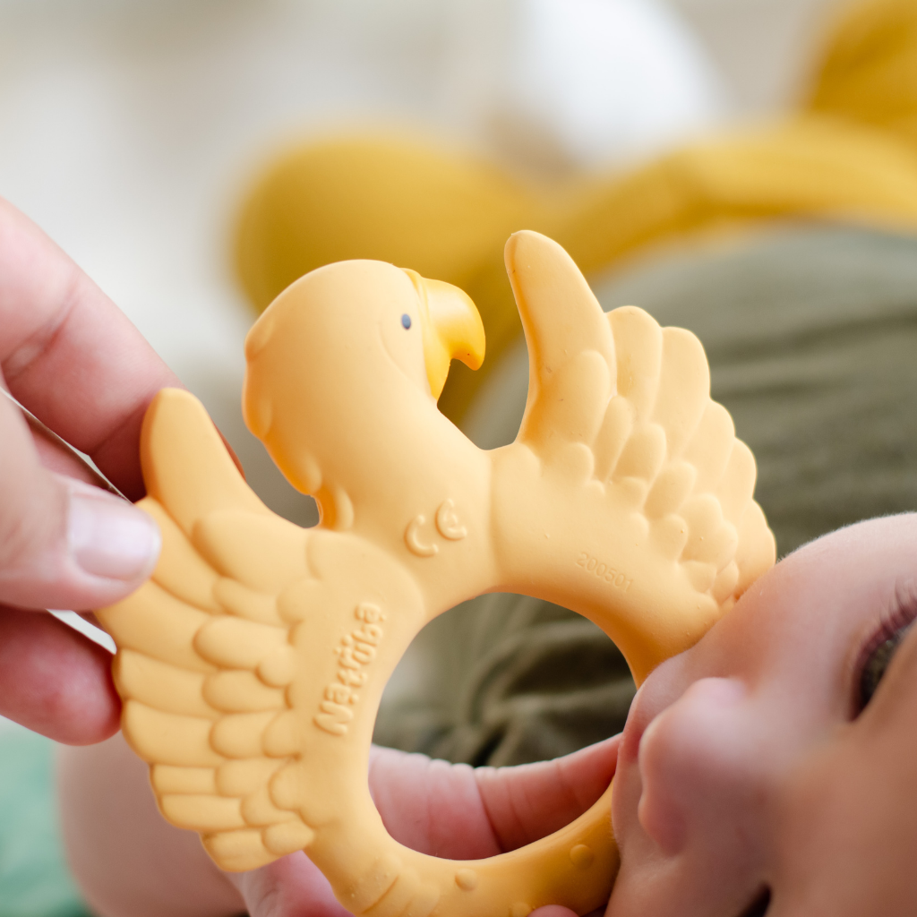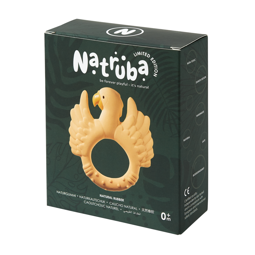 The parrot natruba - Limited edition color - is easy to grasp for small hands and a Perfect relief for painful gums. The parrot has different surfaces for sensory game and has both flexible and hard natural rubber to satisfy all stages of painful gums. The bright color stimulates your child's view.