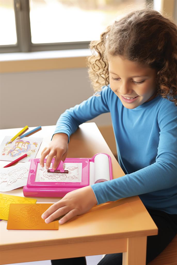 Have fun creating perfect unicorn artwork on this 8-meter roll of paper. Create an artistic unicorn scene by rubbing the pencil across the unicorn art pieces! Change the plates and unroll the paper to create a continuous scene, or tear off each scene for individual unicorns. Includes 8 different unicorn stencils to create the scenes, 2 colored pencils, a pencil holder, and 3 colored pencils. Also includes a handy tote bag for storage.