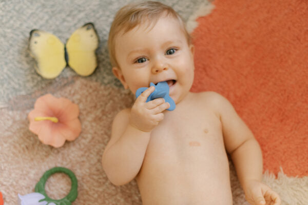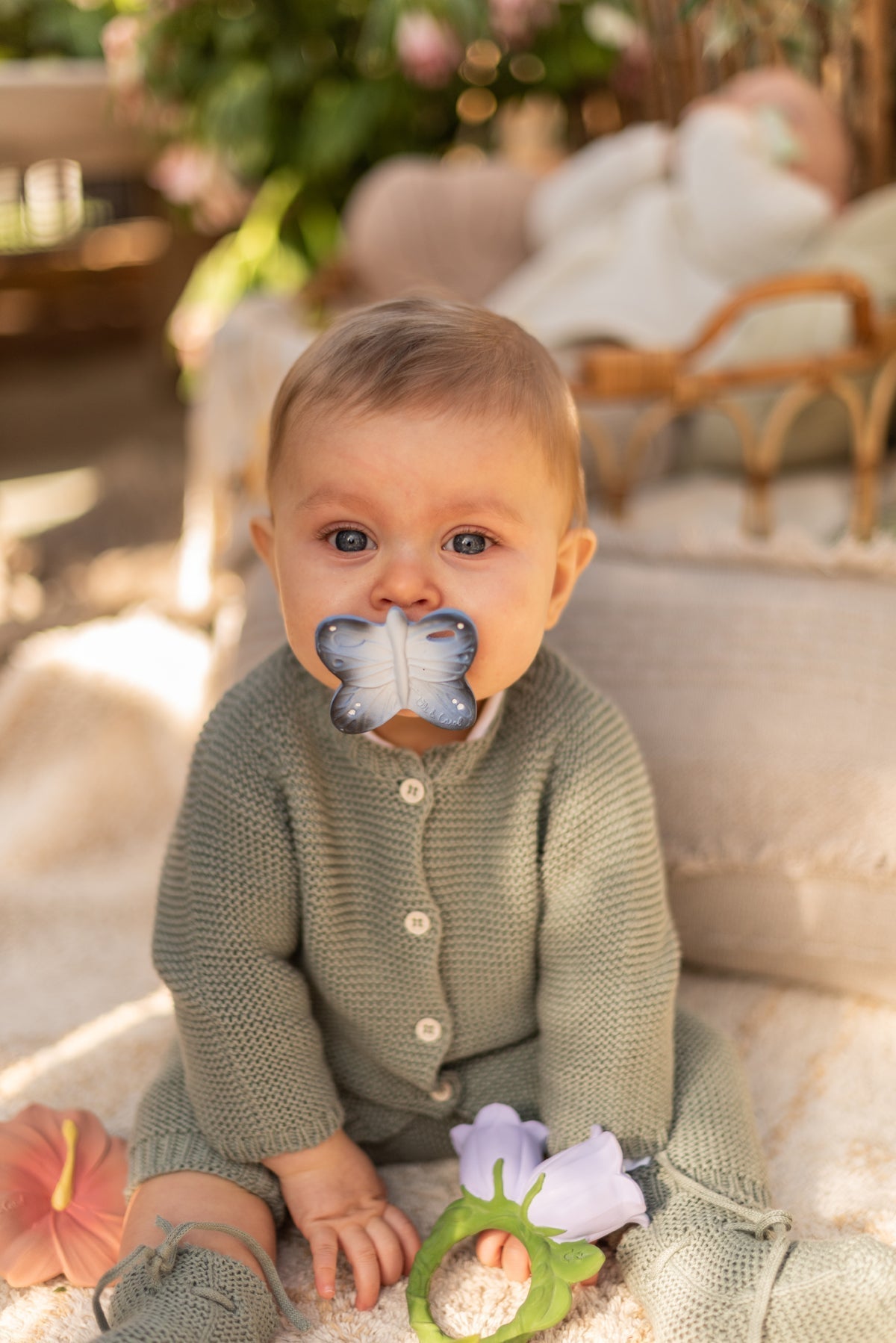 High little butterfly! Blues The Butterfly is a baby dentition toy with ergonomic design. Its details and textures make it very pleasant to soothe the gums of the little ones during the dental thrust.