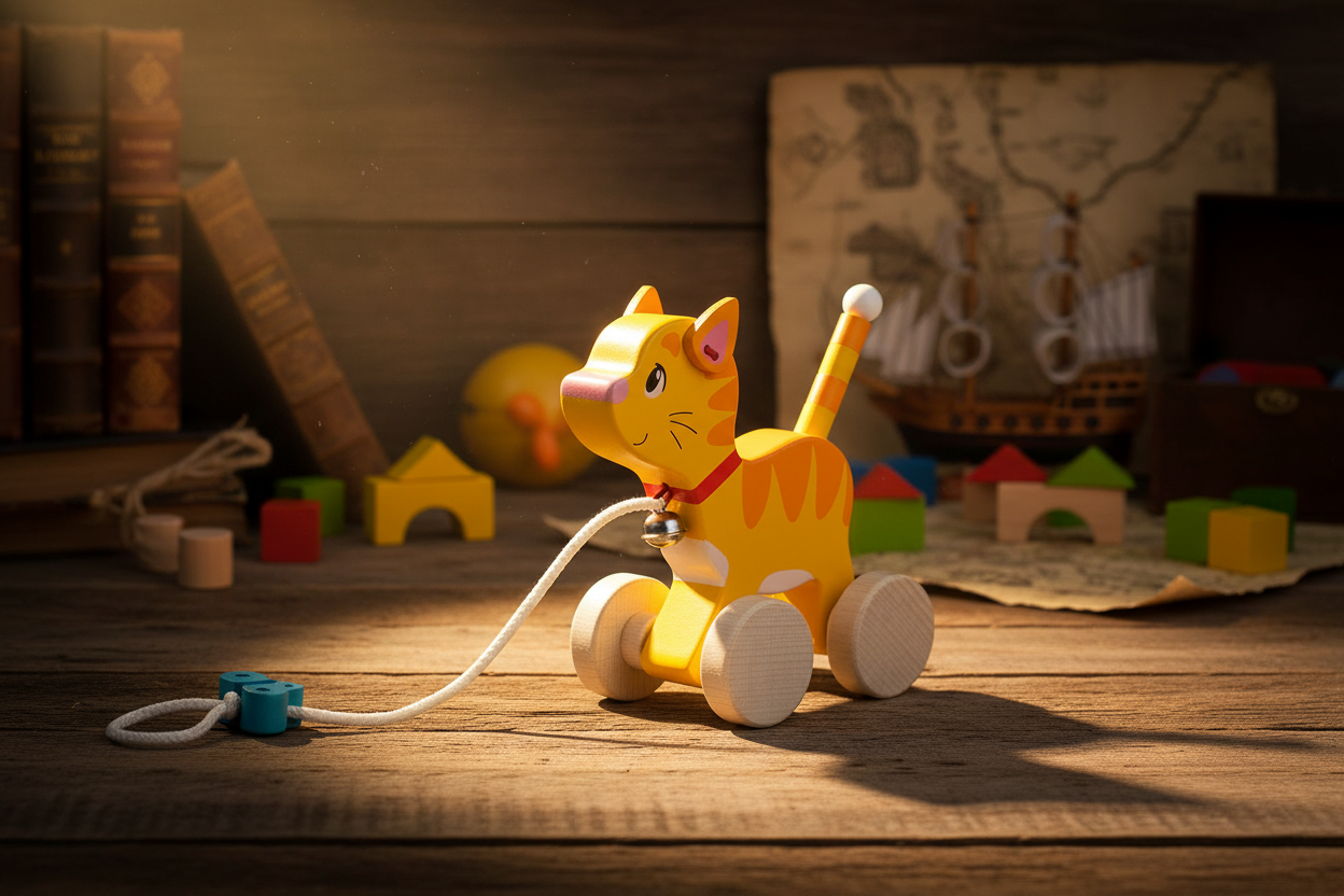 The blue butterfly flutters in front of the cat who watches it with a smile. Here is an adorable wooden pull-along animal that will delight all children. This faithful excursion companion will trigger admiring glances as it passes by.