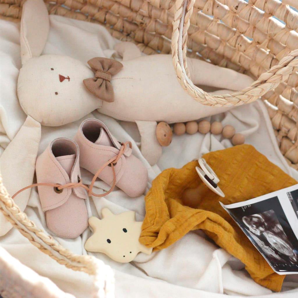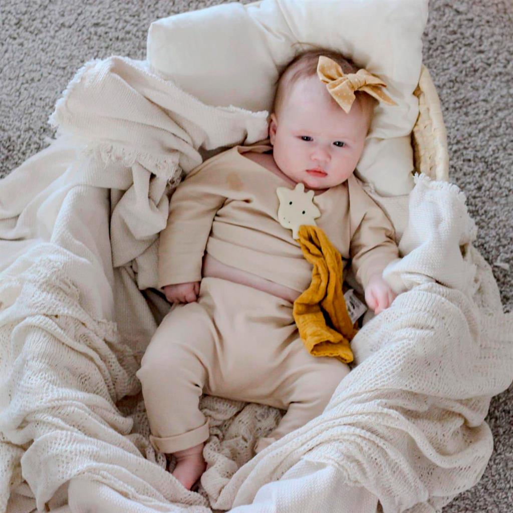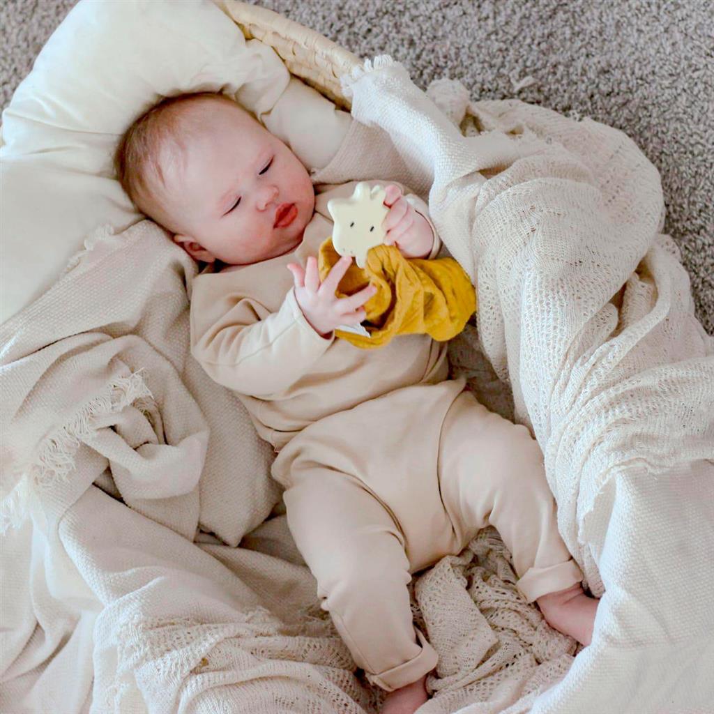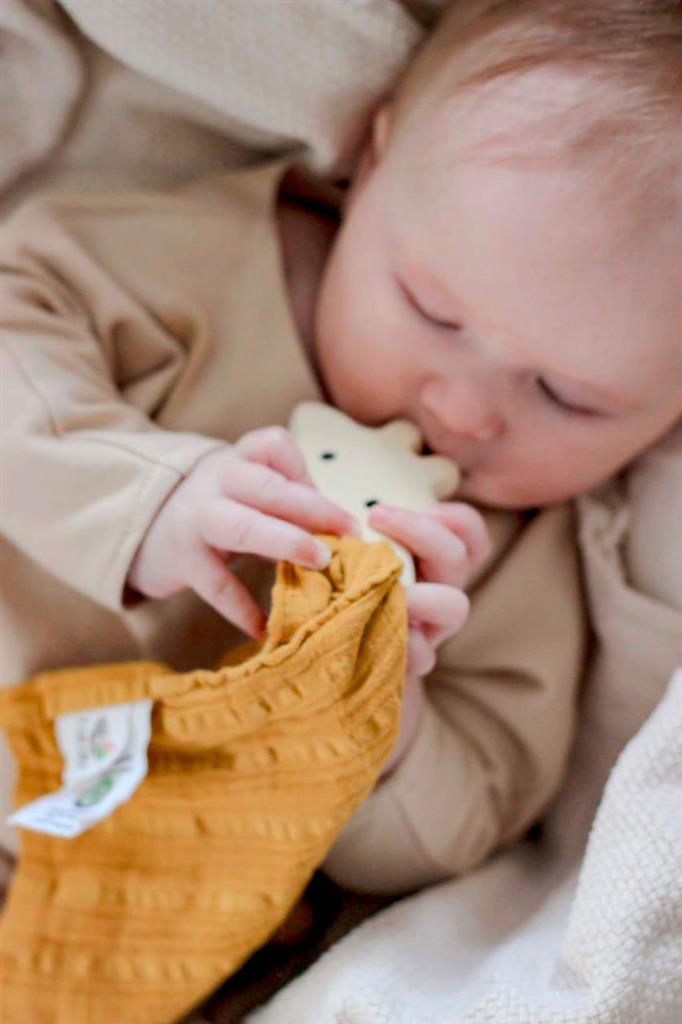 Giraffe in mustard yellow muslin with natural rubber teeth ring.