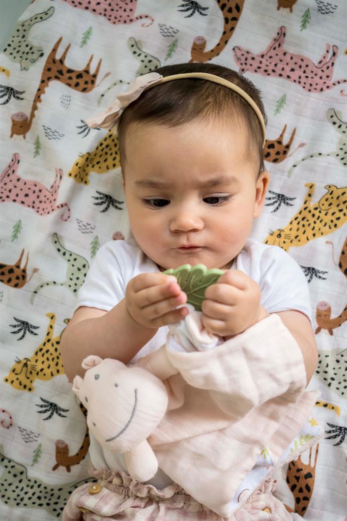 Sage green muslin hippo comforter with natural rubber teething ring.