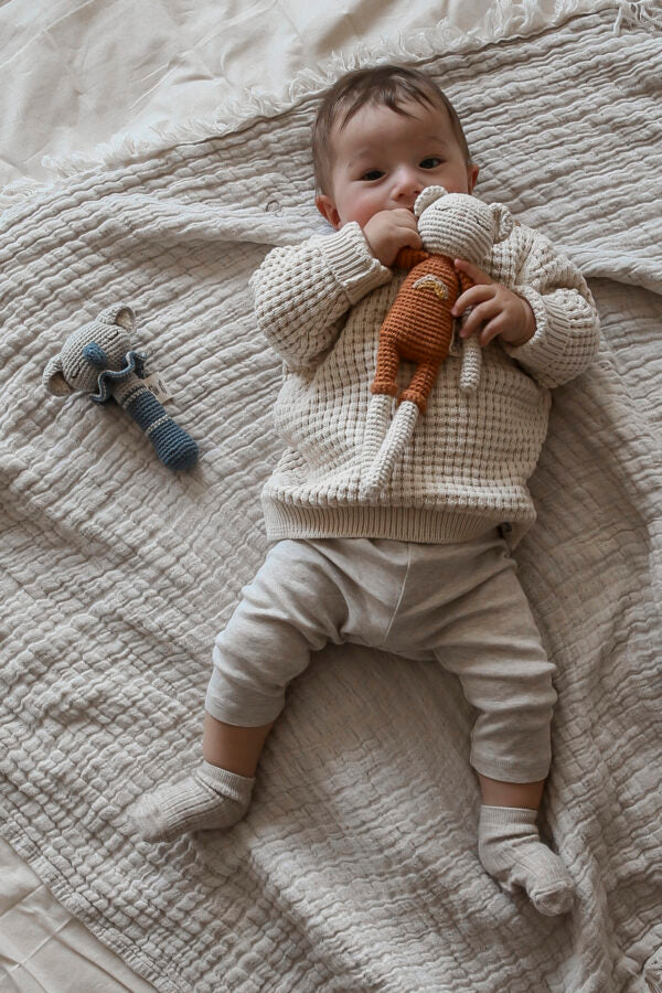 Each toy is filled with an ecological polyester fiber certified according to the Oeko-Tex® standard 100 class I. span> Maple wood ring. Each piece is made by women craftsmen with magic hands, using traditional techniques. span> by choosing the Patti Oslo products you help to give an equitable income to these talented women. span> ethically made in Turkey. span> Maintenance : Always use a soft detergent and cold water. Start by cleaning the stains. If cleaning of the spots is not enough, choose a hand washing program at 30 ° with a soft baby soap, spin at low speed, dry flat. span>