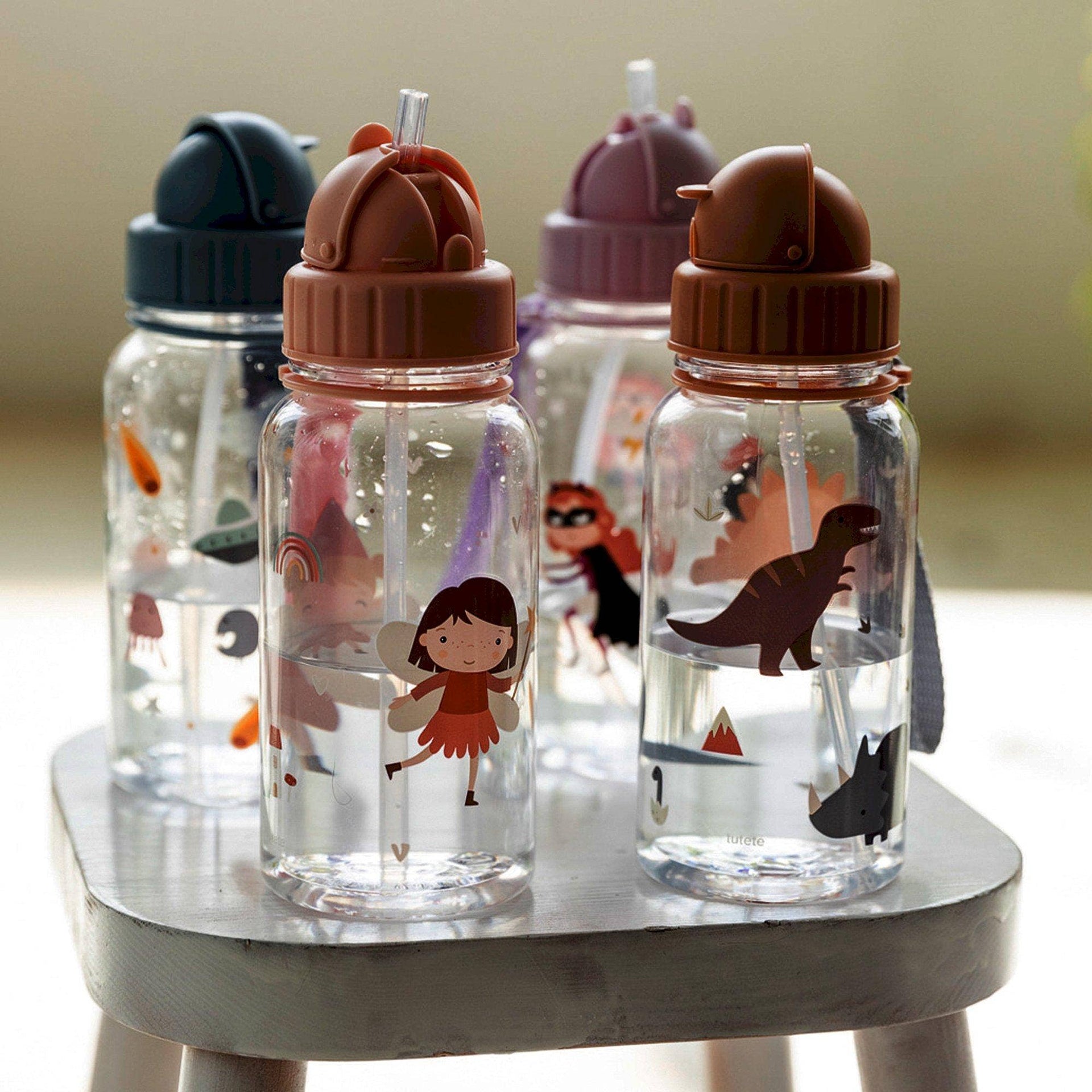 Tritan plastic bottle, exclusive to Tutete The bottle has a flip-up silicone straw that pops out automatically when the lid is opened and is ideal for school.