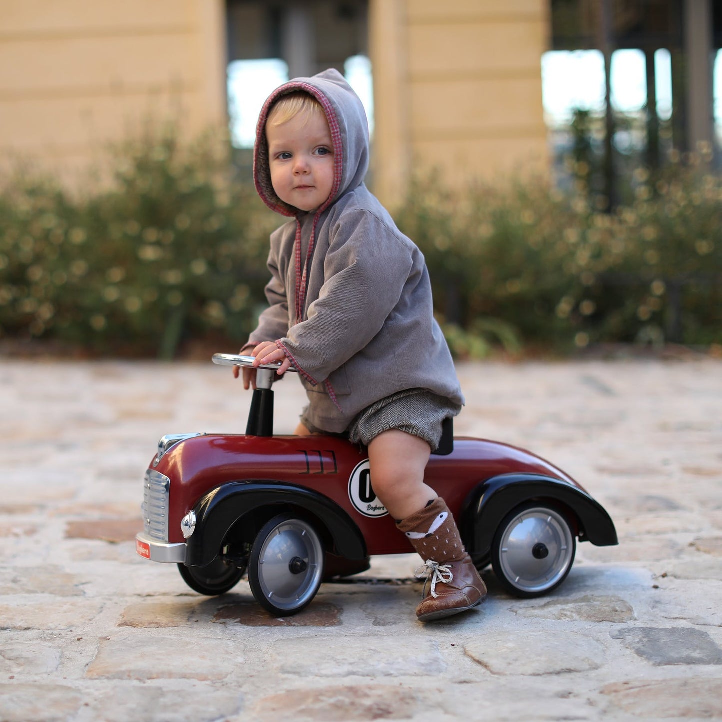 a tapered line, a aerodynamic design and a metallic body! The ultimate for apprentice pilots! Comfortably installed on his speedster Dark Red, very stable and robust, hands on the steering wheel, feet well on the ground, your child will quickly become an ace of the steering wheel! This dark red trotter is equipped with a real functional direction. Baby will quickly take his marks on his new car and the wheels will help him stay stable and move in silence in the house. With its metal bodywork, this trotter is inspired by the old cars of the 1950s. Equipped with such a racing car, the small pilots can imagine beautiful stories and go on an adventure. span>
