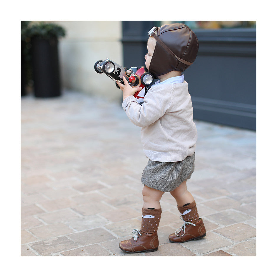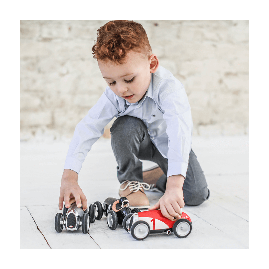 A FUSTALE front and large wheels like old racing cars, for wild races! Because we know that children's games exhibit our carambolization cars, Racing because is made in a very solid ABS plastic and then lacquered and polished by hand. It can thus withstand the most extreme piloting conditions! In the tradition of renowned racing cars, Racing because Red was designed in France by our team of designers, crazy about the steering wheel!